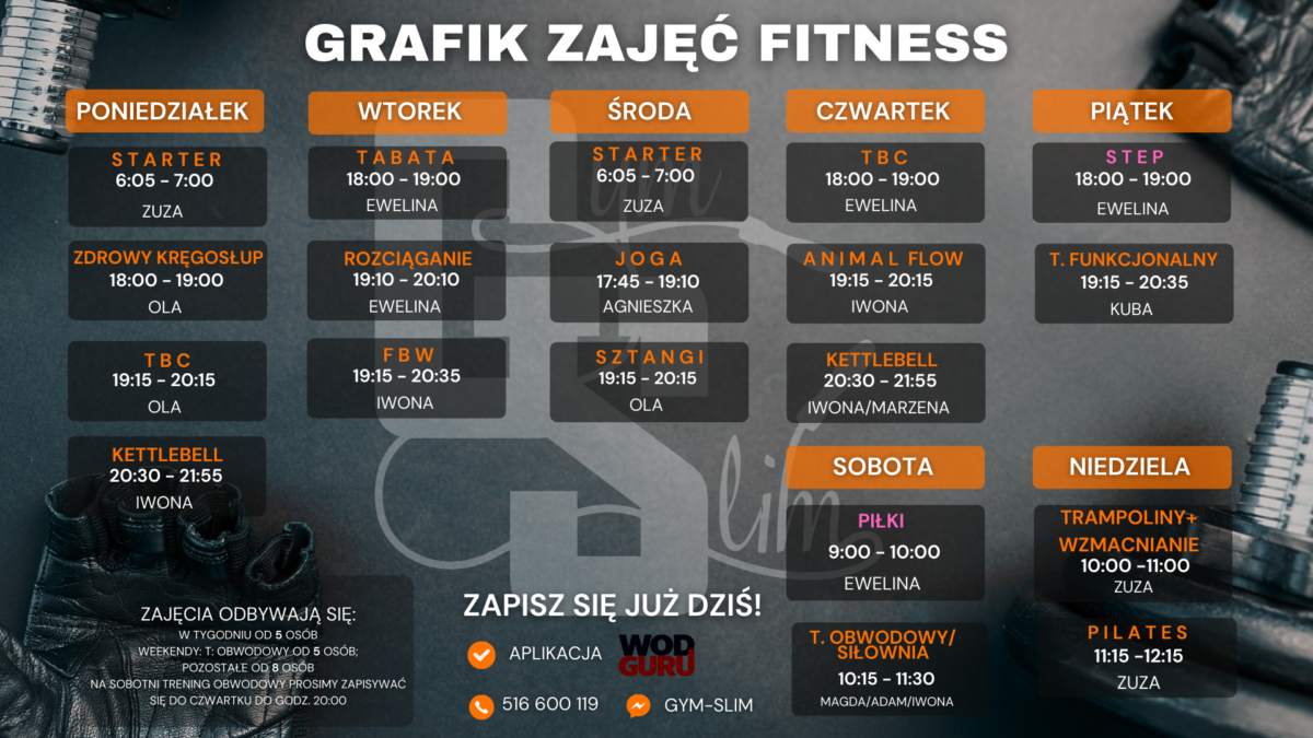 Na zajęcia można zapisać się przez aplikację Wod Guru. Jeśli nie masz jeszcze dostępu skontaktuj się z recepcją 🙂: 516-600-119 lub przez aplikację messenger.